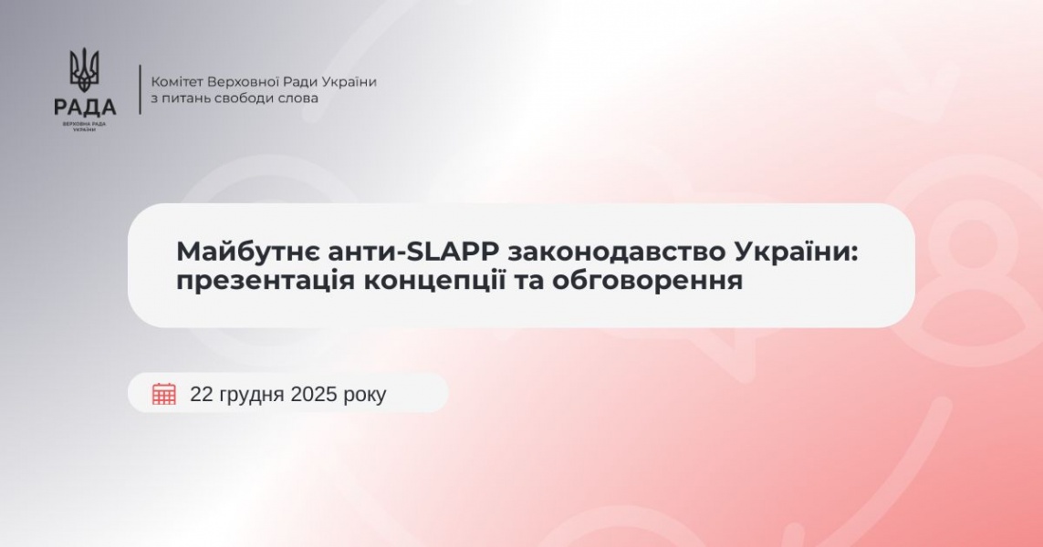 Комітет Верховної Ради України з питань свободи слова спільно з Національною радою України з питань телебачення і радіомовлення та ГО «Платформа прав людини», за підтримки Програми Ради Європи «Захист свободи слова та свободи медіа в Україні – Фаза ІІ» та Національного комітету з співпраці з Міжнародною програмою розвитку комунікацій ЮНЕСКО (IPDC), організовує круглий стіл на тему «Майбутнє анти-SLAPP законодавство України: презентація концепції та обговорення».